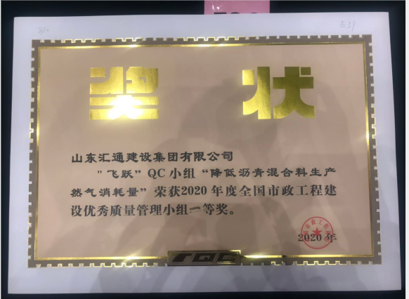 近日,由山東匯通建設集團有限公司組建的“飛躍”和“精進”QC小組參加了中國市政協會舉辦的2020年度全國市政工程建設優秀質量管理評比交流會,并在100多個參會小組中脫穎而出,雙雙榮獲全國市政工程建設優秀質量管理小組一等獎。