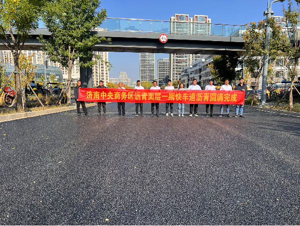 10月24日,隨著最后一車瀝青混合料碾壓完畢,濟南市中央商務區瀝青面層一期快車道瀝青上面層攤鋪工作順利完成。 濟南中央商務區瀝青面層一期包含新濼大街、茂嶺二號路、茂嶺三號路、規劃二號路、規劃一號路、天辰路共6條地面道路,道路總長度8377米,面積134401平方,瀝青總重13440噸。 濟南中央商務區瀝青面層一期項目中標內容只包含瀝青上面層攤鋪,基層由其他單位施工,項目部在進場之初就嚴格把控基層施工質量,積極配合相關單位處理基層病害,確保瀝青面層成形質量。在施工過程中道路兩側地塊施工項目及居民眾多,項目部前期縝密策劃交通組織方案,提前發布施工公告通知周邊居民及單位,將交通擁堵降至最