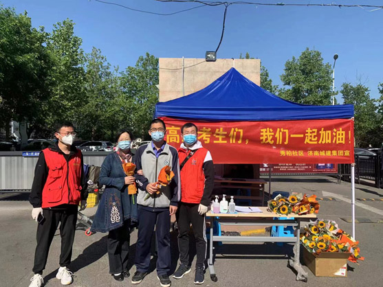 “高三考生們,我們一起加油!” 在領秀城秀柏社區的防疫志愿服務站,一條大紅色的條幅,一朵朵象征著太陽與光明、生機與活力的太陽花在陽光的照射下格外絢爛醒目。今天是五一勞動節也是高三考生因疫情封閉后第一天復課的日子。 在這個特別的節日里,領秀城秀柏社區的防疫先鋒隊第一小組組長榮峰提前一天就定購好了100朵鮮花,一大早,當高三學生走到小區門口,志愿者們就將一朵朵鮮艷的太陽花和祝??ㄋ偷綄W生手中,“想起了向日葵就想起了陽光,微笑和美好常在,我們一起加油!” “叔叔,太謝謝你們了,你們在加班加點為我們服務,還給我們送花,真是讓我倍受鼓舞?!薄疤兄x你們了,謝謝志愿者們這些日子以來對我們