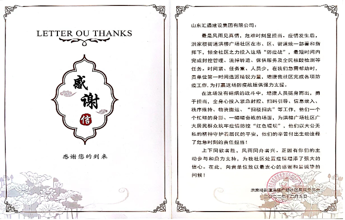 “抗疫奮戰 堅守一線 共駐共建 情暖民心” 。12月5日,洪樓廣場社區黨支部書記尹延偉給集團匯通公司下沉社區服務隊送來錦旗和感謝信,表達了對志愿隊在此次抗擊疫情期間不分晝夜、義無反顧堅守一線的高度贊揚和誠摯謝意。